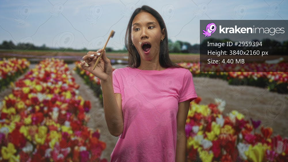 Woman holding wooden toothbrush to mouth with mouth open in a studio tulip field backdrop; oral care calm.