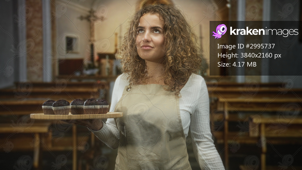 Woman holding wooden tray of chocolate muffins, hand visible, inside a church building; serenity offering.