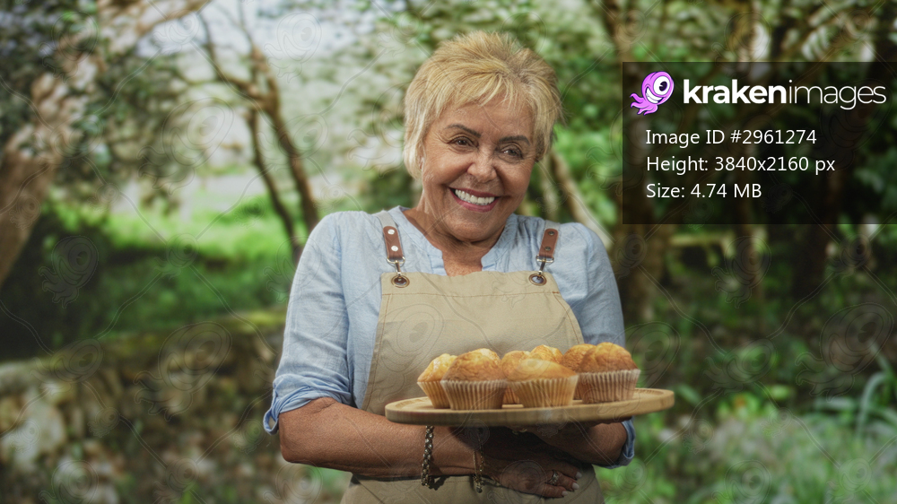 Woman holding wooden tray of muffins with bare hands and bracelets, smiling and presenting the baked goods in a sunlit garden with stone wall; joy.