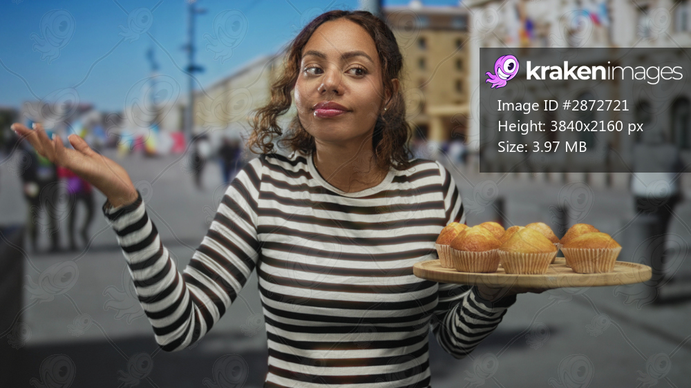 Woman holding wooden tray of muffins with palm up shrug gesture on a city street in front of buildings and pedestrians; curiosity.