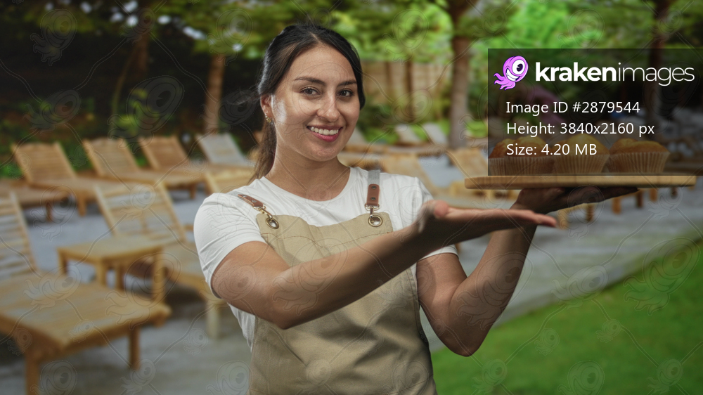 Woman holding wooden tray of muffins and smiling in forest setting while extending an open hand and showcasing baked goods; friendly service.