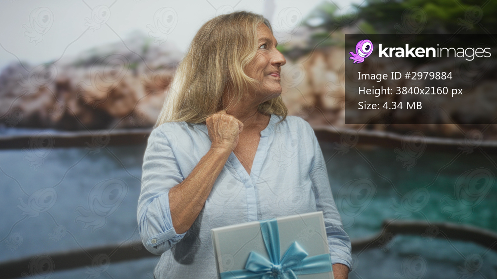 Woman holding wrapped gift with blue ribbon, hand on chin, wearing light blue blouse in a rocky seaside cove by turquoise water and wooden railing; contemplation. - Kraken Images