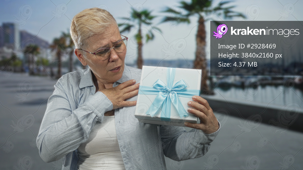 Woman holding wrapped gift box with blue ribbon, hand on chest gesture on street by marina boats and palm trees, wearing glasses and light shirt; surprise. - Kraken Images