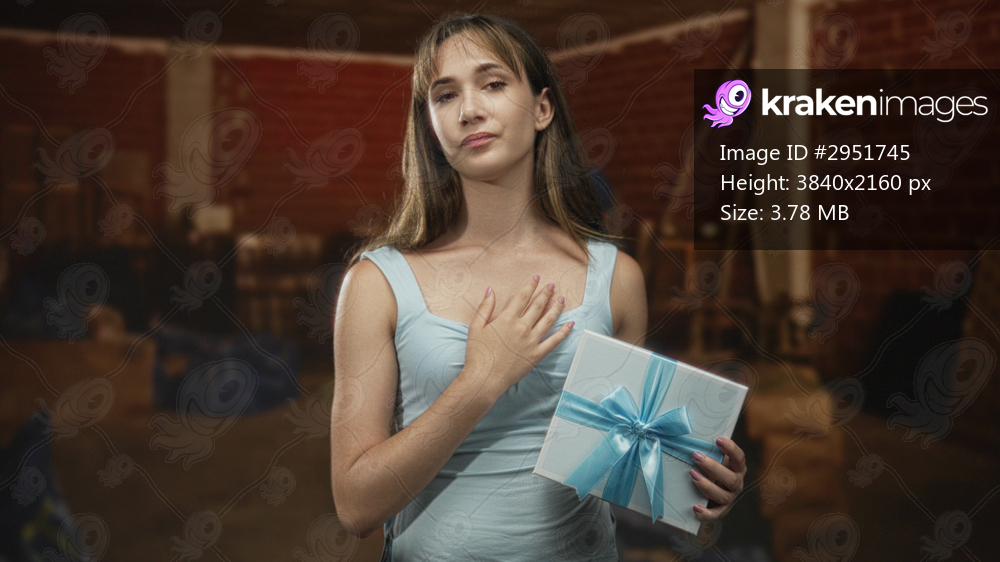 Woman holding wrapped gift box with blue ribbon in a building construction site, wearing a light blue sleeveless top; quiet pensive.