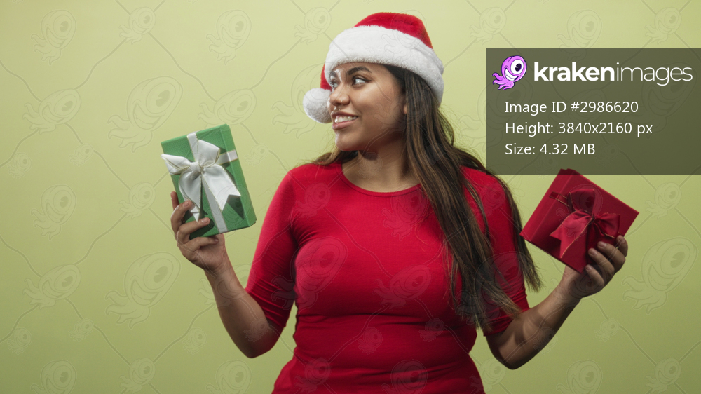 Woman holding wrapped green and red gifts and smiling while wearing a santa hat in studio; festive cheerful.