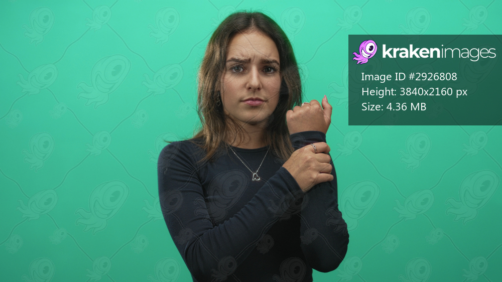 Woman holding wrist with both hands in teal studio, young hispanic subject wearing navy long sleeve and heart necklace, eyes closed with pained expression; pain injury. - Kraken Images