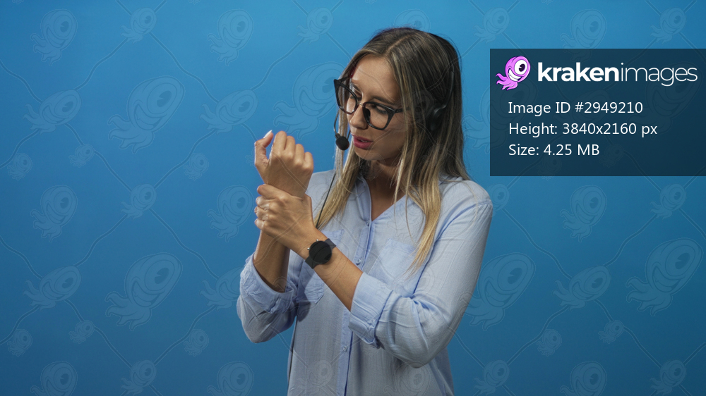 Woman holding wrist with headset and glasses in blue studio, checking watch and rubbing wrist after strain; concern recovery.