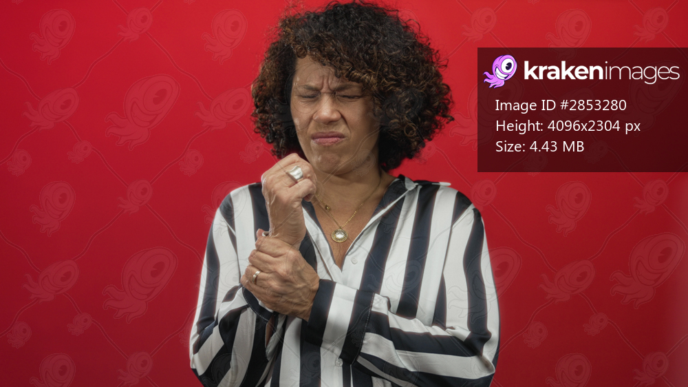 Woman holding wrist near face in red studio with a grimacing expression wearing striped shirt and silver rings on fingers; discomfort.