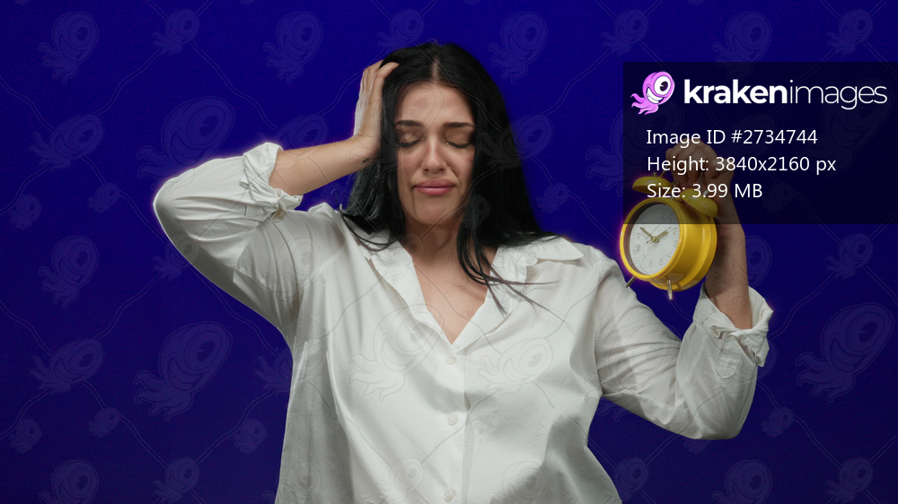 Woman holding yellow alarm clock with tired expression over isolated blue background in a studio.