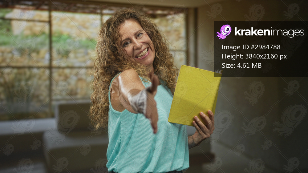 Woman holding yellow book extends right hand toward camera in a building living room, smiling and offering the book to viewer; warm joyful welcome.