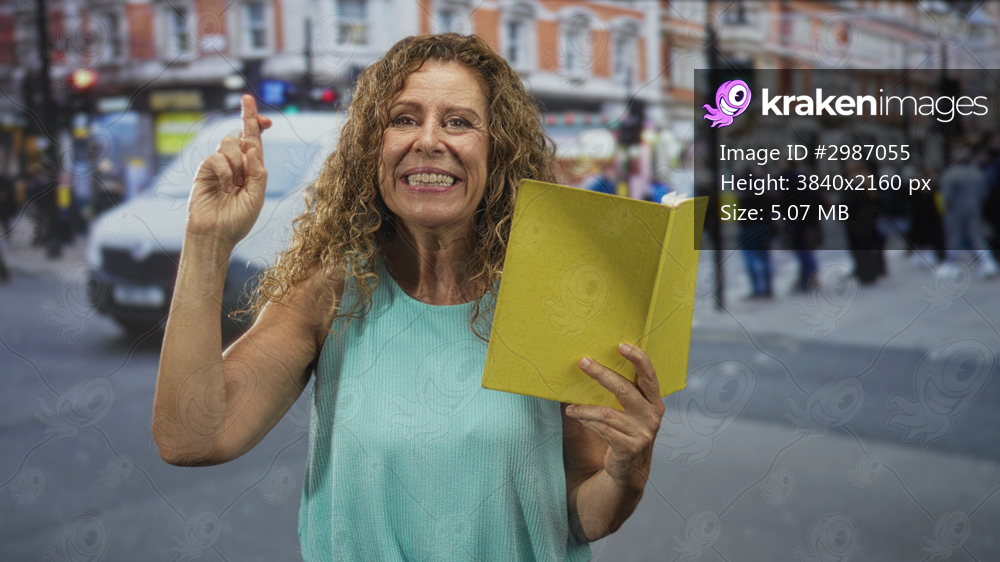 Woman holding yellow book, fingers crossed raised, reading aloud while gesturing on a crowded city street crosswalk amid blurred pedestrians and traffic; hopeful recitation. - Kraken Images