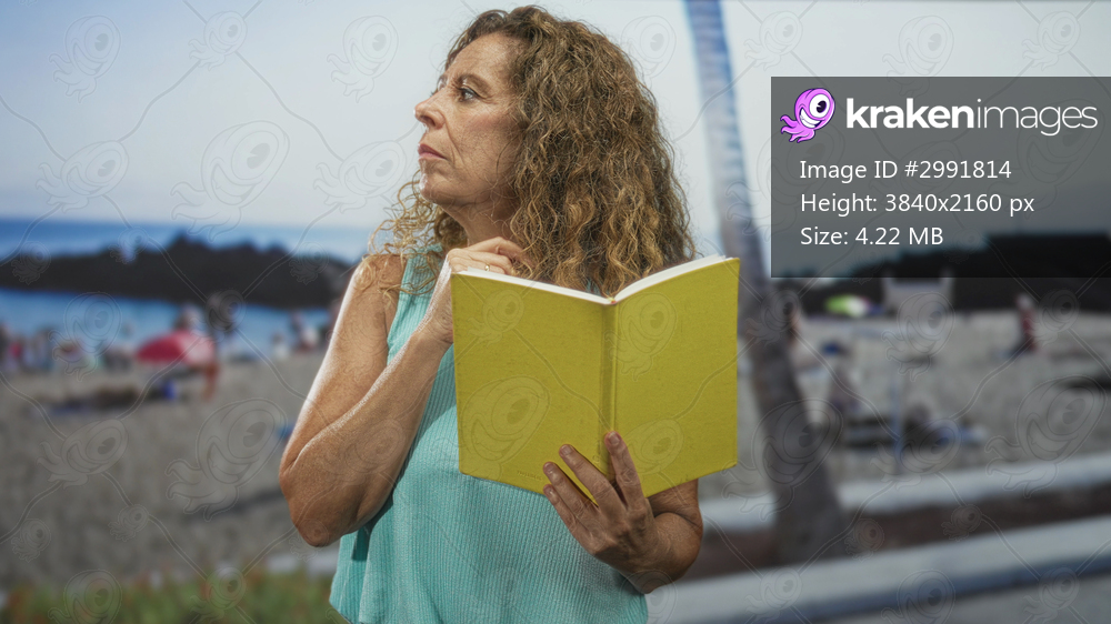 Woman holding yellow book, hand at neck while reading beside a palm tree on a busy beach promenade with blurred people and umbrellas; contemplation calm. - Kraken Images