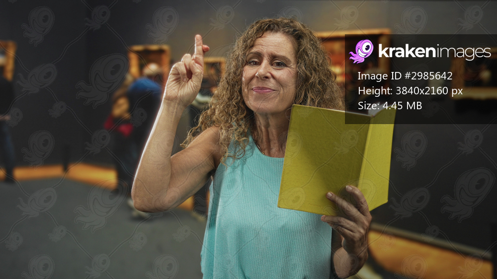 Woman holding yellow book points finger up and smiles with eyes closed in art museum; storytelling memory serenity.