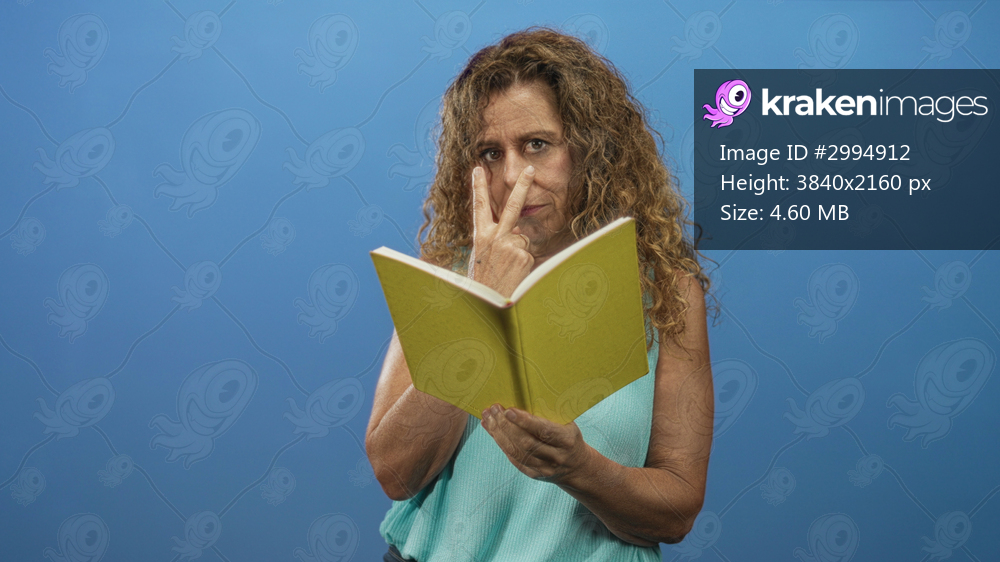 Woman holding yellow book, points two fingers to face while reading against blue backdrop in studio; thoughtful mystery.
