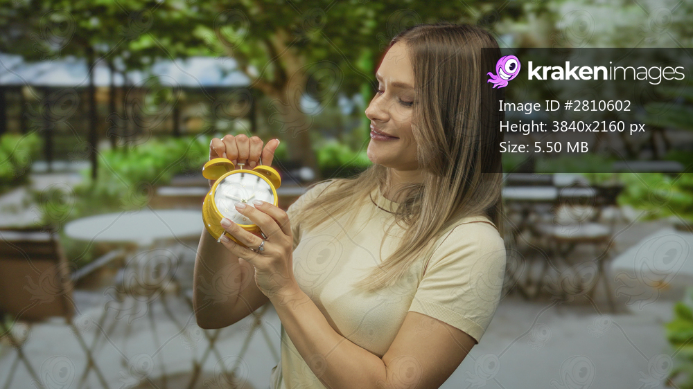 Woman holding yellow clock on outdoor terrace of city restaurant surrounded by greenery and empty tables, conveying relaxed and serene urban setting in daytime. - Kraken Images