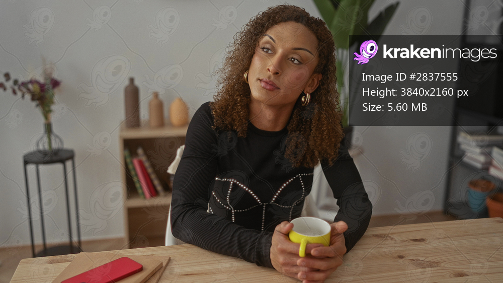 Woman holding yellow coffee mug at wooden desk in bright office with bookshelf and potted plant; quiet reflection.