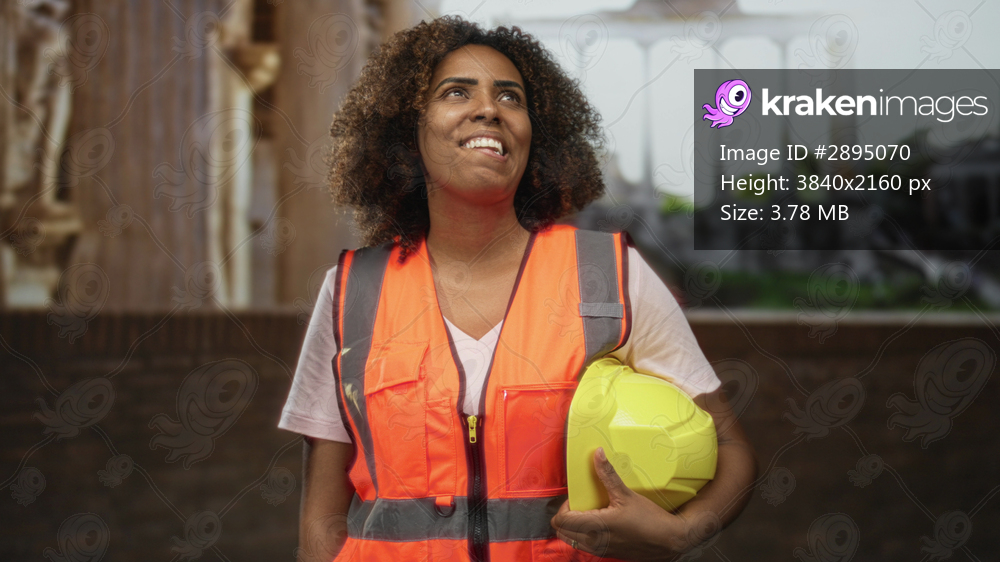 Woman holding yellow hardhat and wearing orange safety vest at roman ruins building, looking up and smiling; confidence career aspiration.