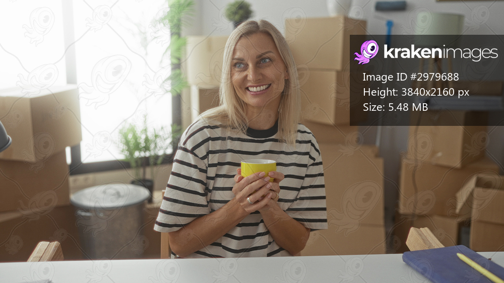 Woman holding yellow mug with both hands in building surrounded by cardboard moving boxes and plants; new home contentment.