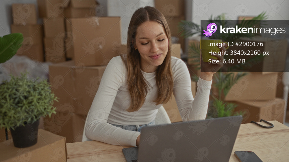 Woman holding yellow mug in right hand while typing on laptop amid stacked cardboard boxes in building; new home contentment.