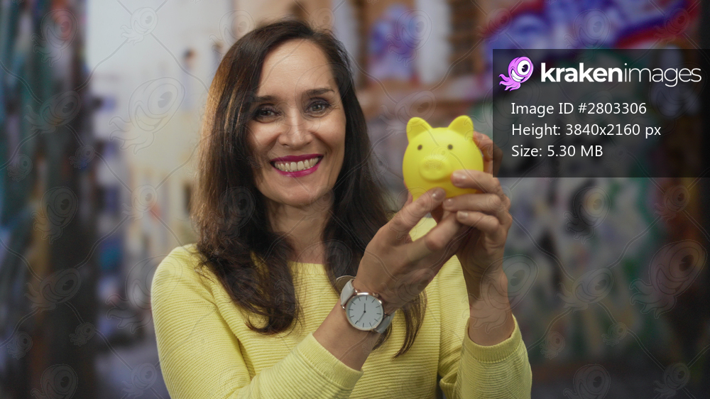 Woman holding yellow piggy bank outdoors against graffiti-covered wall, showcasing urban finance concept.