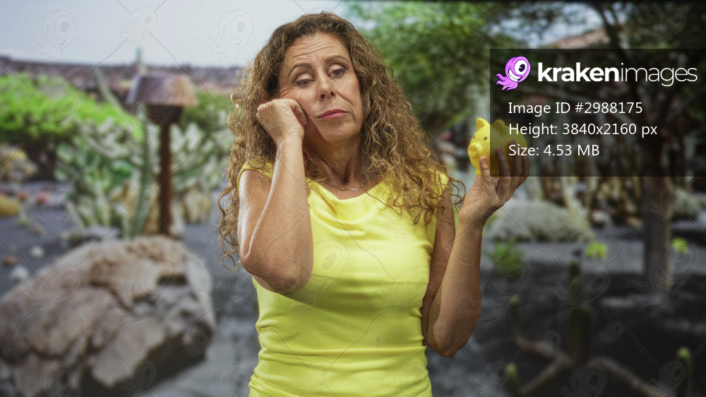 Woman holding yellow piggybank in a cactus garden with hand on chin pensive gesture; financial concern.