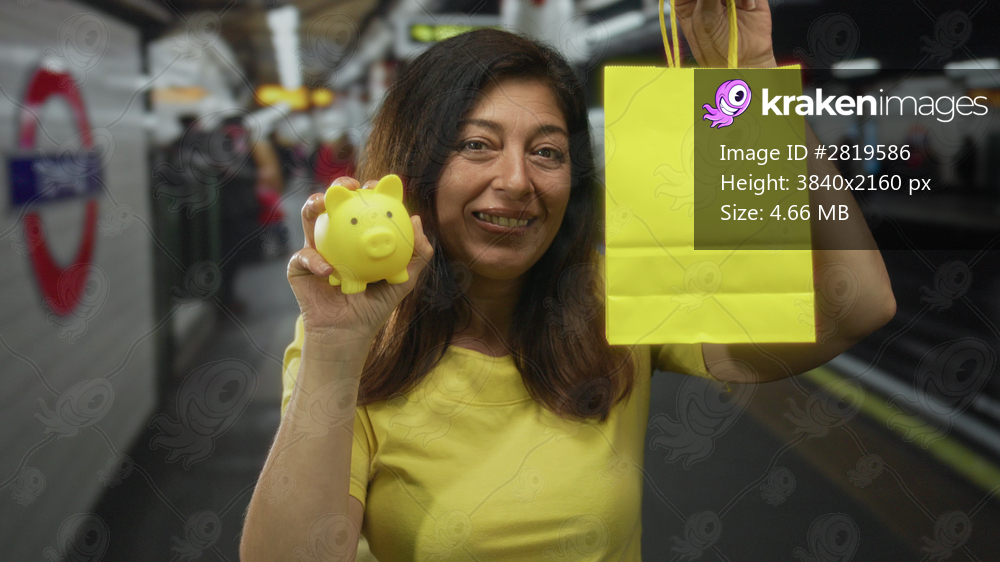 Woman holding yellow piggybank and yellow shopping bag at train station with smiling expression; money optimism.