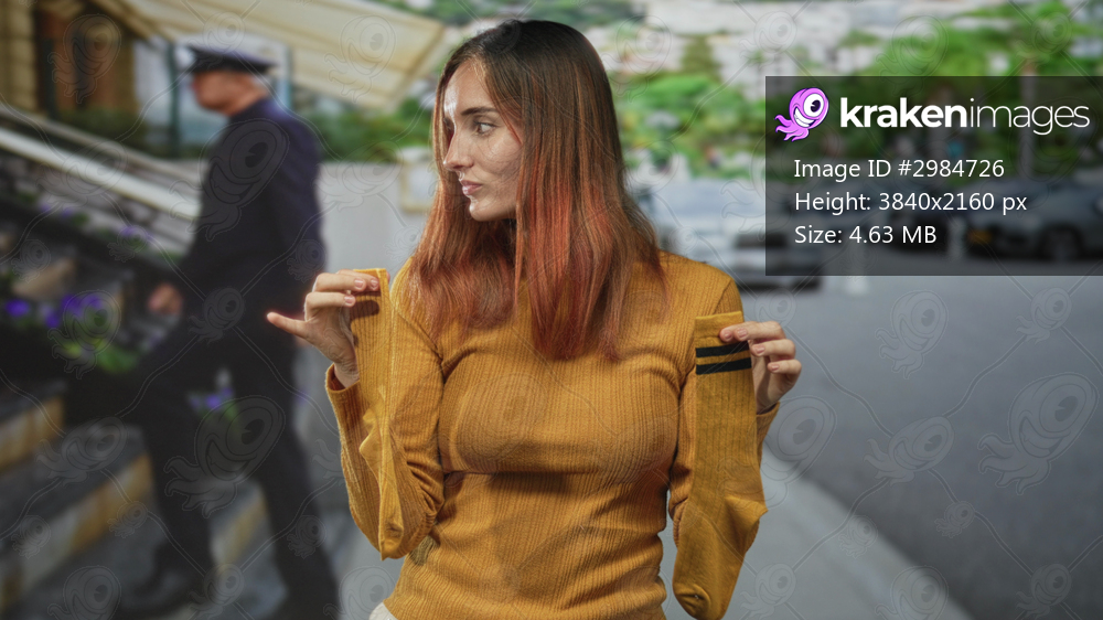 Woman holding yellow sock with both hands, fingers pinching fabric and glancing sideways on a street with parked cars and stairs; curiosity.