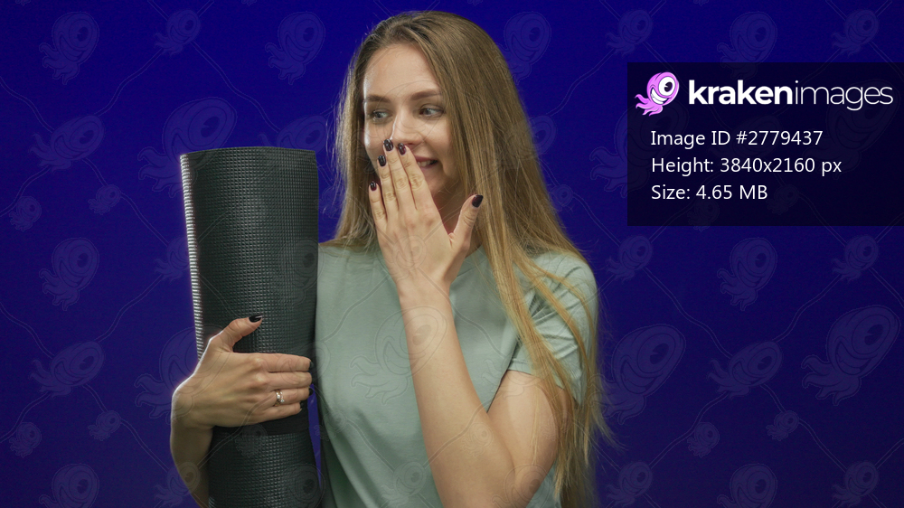Woman holding yoga mat against blue background looks surprised with hand over mouth, expressing excitement and innocence in a fitness setting.
