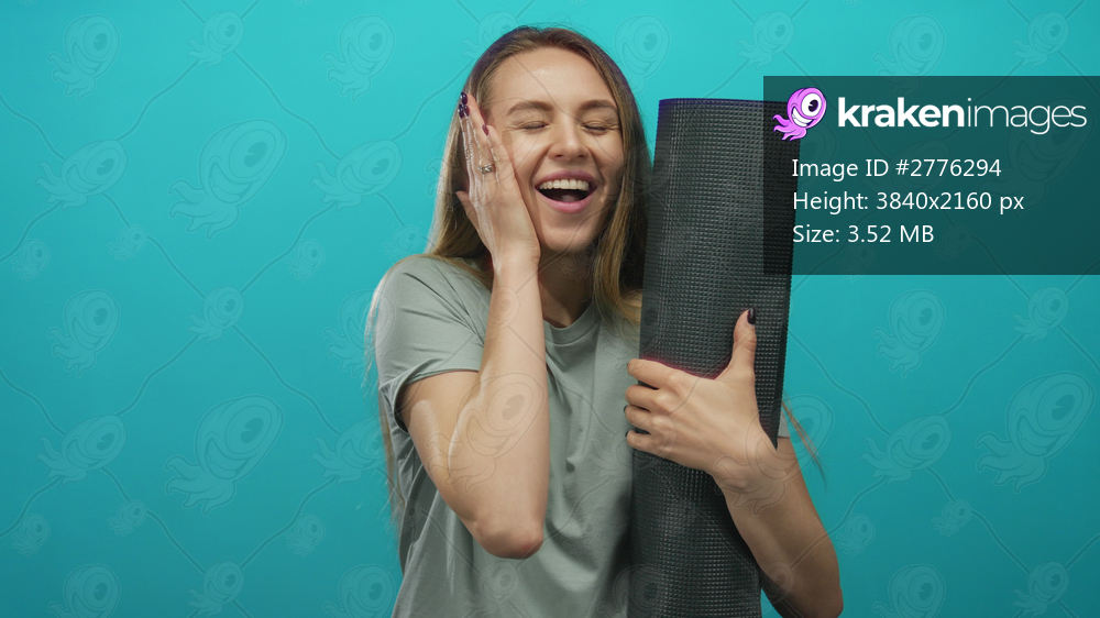 Woman holding yoga mat over isolated green background, showcasing surprise and excitement, ideal for fitness or wellness themes, appealing to health-conscious individuals. - Kraken Images