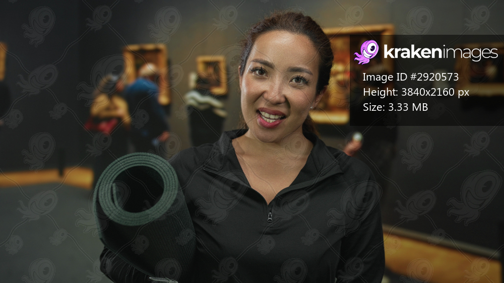 Woman holding yoga mat and smiling in an art gallery building with paintings and visitors in the interior; wellness joy.