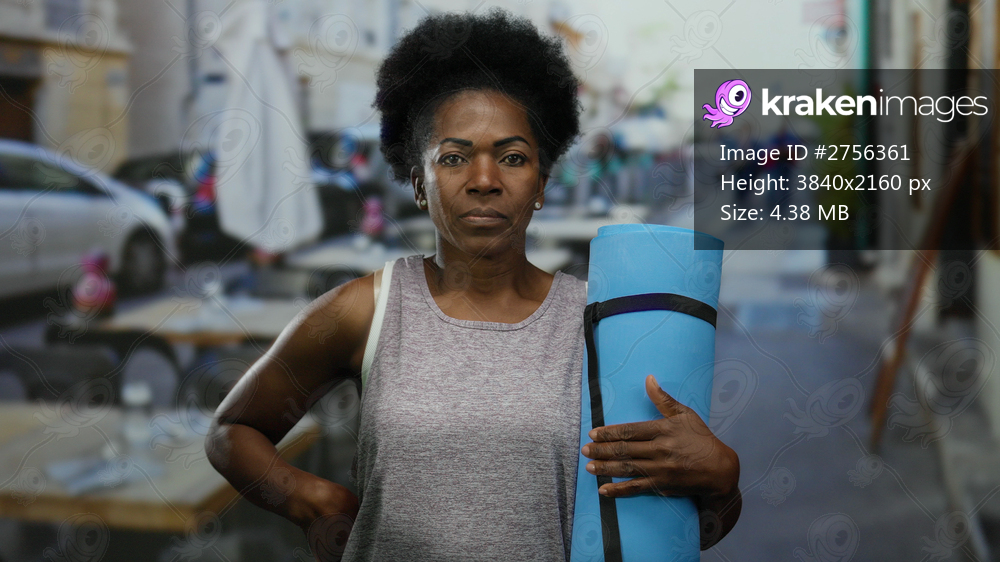 Woman holding yoga mat stands on outdoor terrace of a vibrant city street restaurant, embodying urban tranquility.