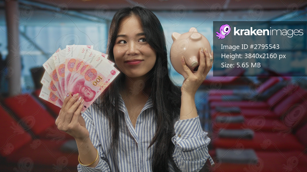 Woman holding yuan banknotes and piggy bank on cruise boat outdoors by the seaside, smiling surrounded by relaxed vacation atmosphere and potential financial savings. - Kraken Images