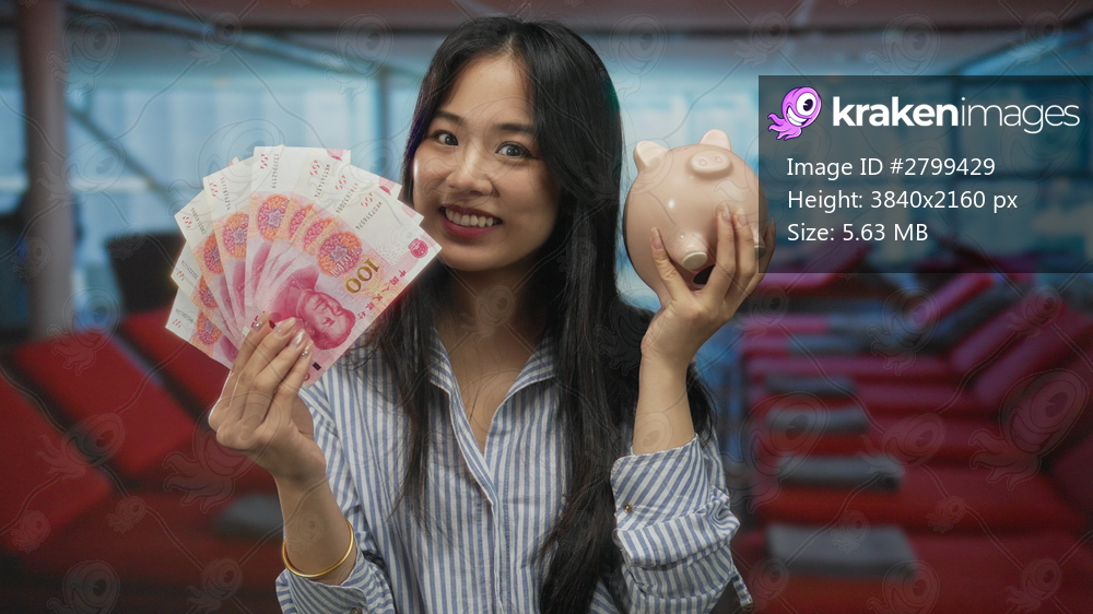 Woman holding yuan banknotes and piggy bank on cruise boat outdoors by the seaside, smiling surrounded by relaxed vacation atmosphere and potential financial savings. - Kraken Images