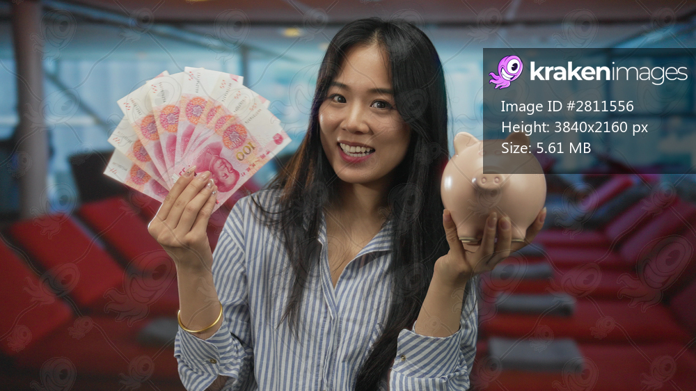 Woman holding yuan banknotes and piggy bank on cruise boat outdoors by the seaside, smiling surrounded by relaxed vacation atmosphere and potential financial savings. - Kraken Images