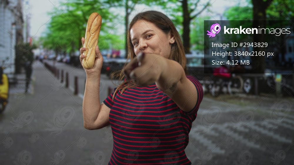 Woman holds a baguette and points finger forward on street near parked cars, smiling at camera; playful confidence.