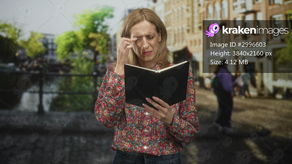 Woman holds a black book, finger rubbing near eye while reading on street by canal; concentration frustration.