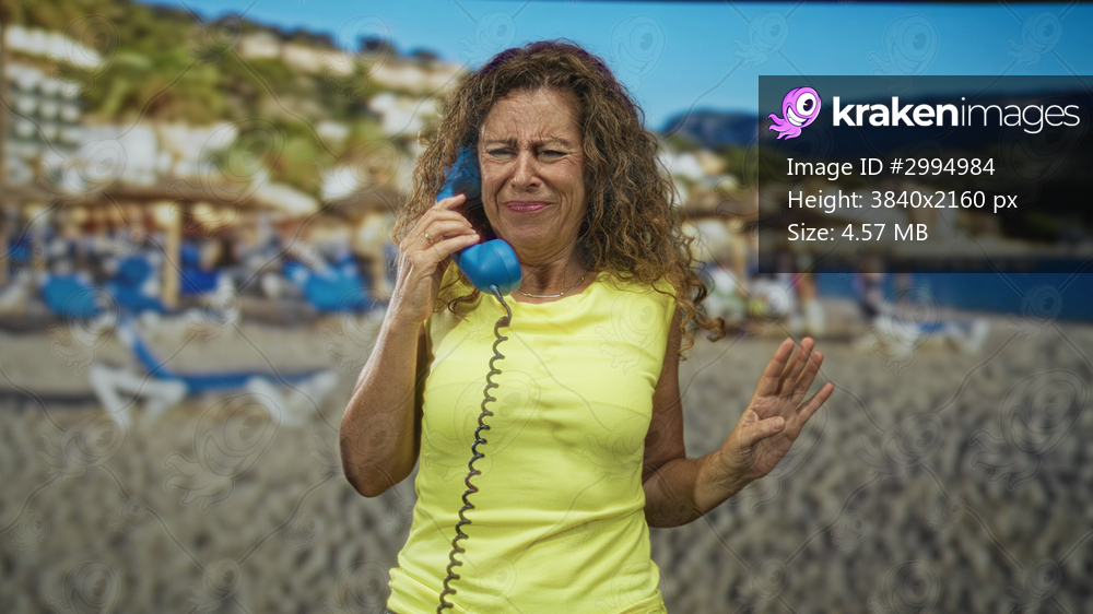 Woman holds a blue corded telephone to her ear and raises a hand palm out in a crowded beach resort; frustration.