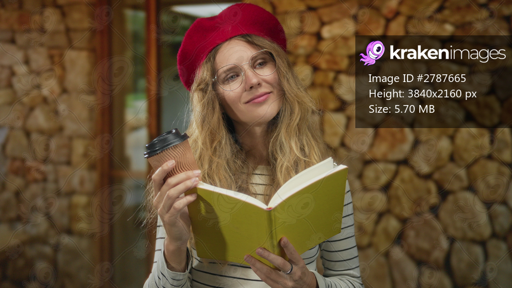 Woman holds a book during a reading interior moment with blonde locks and young charm wearing glasses and a beret while sipping coffee beside a stonewall. - Kraken Images