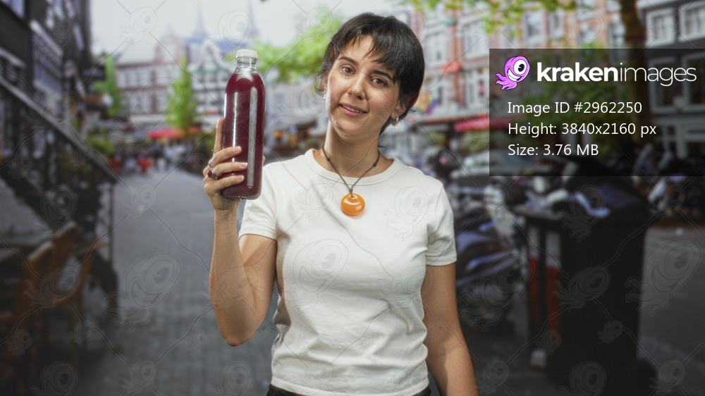 Woman holds a bottle of pomegranate juice up while smiling and presenting it on a lively city street; health joy.