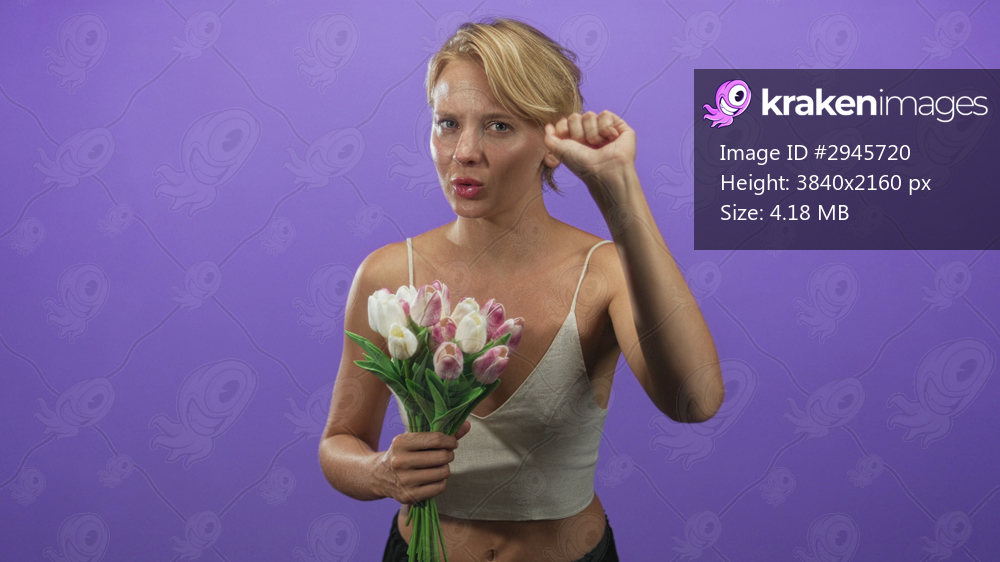 Woman holds a bouquet of pink and white tulips and raises a fist near head against a purple studio backdrop, wearing a sleeveless top; serenity.