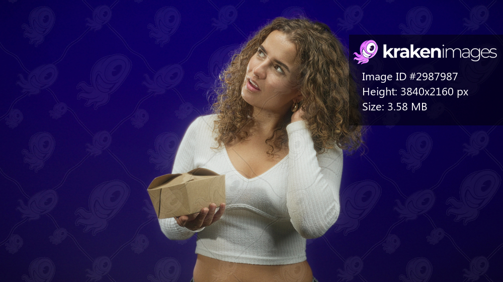 Woman holds a cardboard takeout box with hand at hair, casual crop showing midriff in studio setting; curiosity discovery.