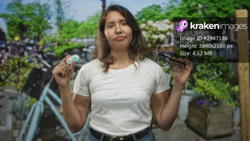Woman holds a contact lens case in one hand and eyeglasses in the other while standing on a street with a bicycle and planter boxes; annoyance indecision choice dilemma. - Kraken Images