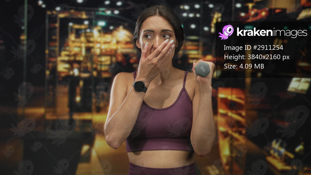 Woman holds a dumbbell at shoulder and covers mouth with hand in building exhibit wearing purple sports bra and leggings; fitness determination.