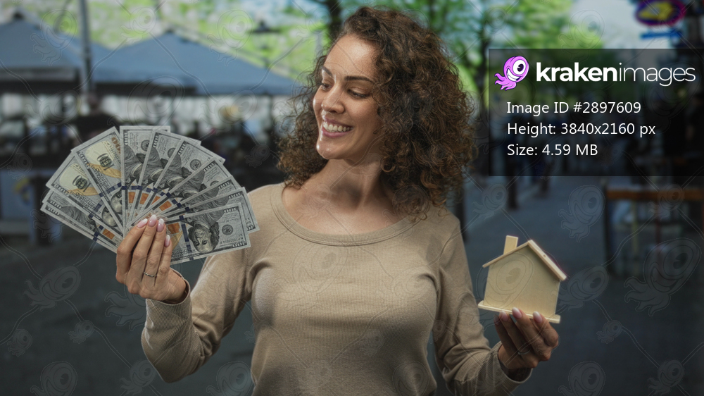 Woman holds a fan of cash in one hand and a small wooden house model while smiling on a busy street; mortgage planning confidence.