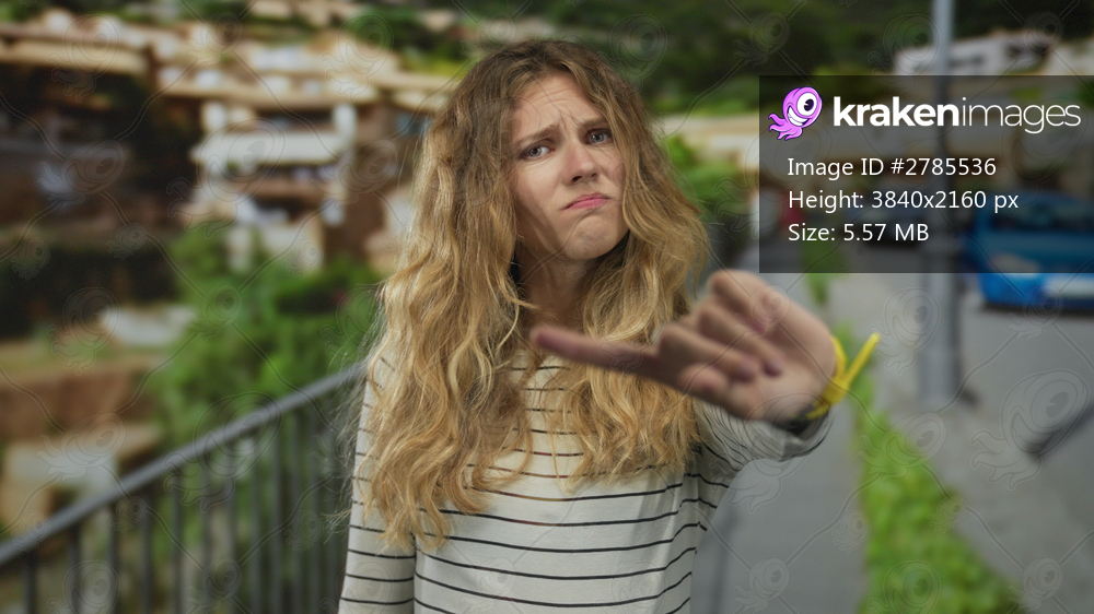Woman holds a finger up to signal stop on a street as a blonde young model uses hand gesture for disapproval in an outdoor scene.
