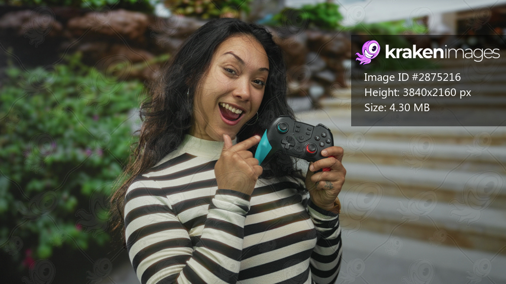 Woman holds a game controller with both hands and smiles while standing on building steps near greenery; joyful play.