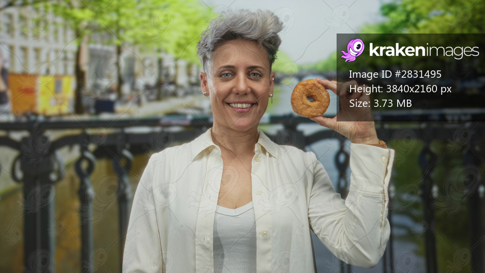 Woman holds a glazed donut with thumb and forefinger on street canal bridge railing under green trees; enjoyment.