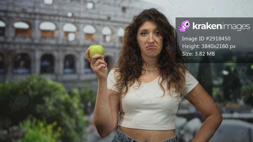 Woman holds a green apple up near her face in front of the roman coliseum building, cropped to waist and standing outdoors; skepticism choice.