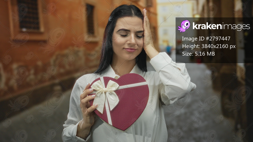 Woman holds a heart-shaped gift box on a street, showing mixed emotions outdoors.