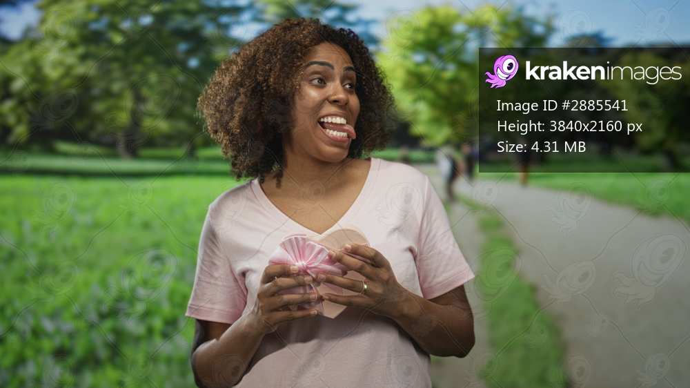 Woman holds a heart shaped gift and sticks tongue while standing on a park path with hands showing a ring; playful joy.